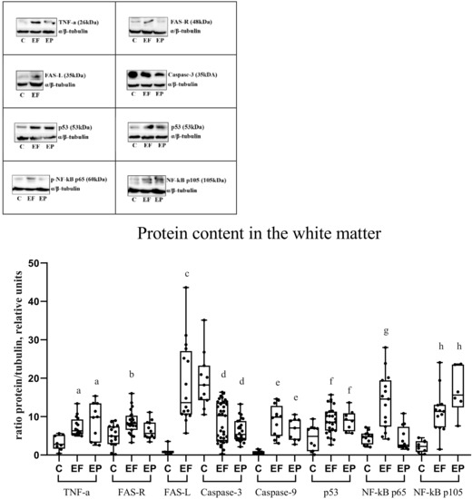 Content of TNF-α, FAS-R, FAS-L, caspase-3, caspase-9, p53, p-NF-kB p65, p-NF-kB p105 in the white matter of the temporal lobe of the brain. Lysates of human white matter biopsy were studied on a 10% polyacrylamide gel by Western blot. C, control group; EF, epileptic focus; EP, perifocal zone. Significant differences: a-differences in the content of TNF-α protein in the white matter compared with the control group, statistically significant at p < 0.05; b, differences in the content of FAS-R protein in the white matter compared to the control group, statistically significant at p < 0.05; c, differences in the content of FAS-L protein in the white matter compared with the control group, statistically significant at p < 0.05; d, differences in the content of caspase-3 protein in the white matter compared to the control group, statistically significant at p < 0.05; e, differences in the content of caspase-9 protein in white matter in comparison with the control group, statistically significant at p < 0.05; f, differences in the content of p53 protein in the white matter in comparison with the control group, statistically significant at p < 0.05; g, differences in the content of p-NF-kB p65 protein in white matter compared to the control group, statistically significant at p < 0.05; h, differences in the content of NF-kB p105 protein in white matter compared to the control group, statistically significant at p < 0.05.
