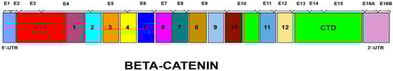 - Nollet, F.; Berx, G.; Molemans, F.; van Roy, F. Genomic organization of the human beta-catenin gene (CTNNB1). Genomics 1996, 32, 413–424. [Google Scholar] [CrossRef]