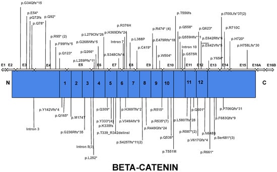 - Kuechler, A.; Willemsen, M.H.; Albrecht, B.; Bacino, C.A.; Bartholomew, D.W.; van Bokhoven, H.; van den Boogaard, M.J.; Bramswig, N.; Buttner, C.; Cremer, K.; et al. De novo mutations in beta-catenin (CTNNB1) appear to be a frequent cause of intellectual disability: Expanding the mutational and clinical spectrum. Hum. Genet. 2015, 134, 97–109. [Google Scholar] [CrossRef] [PubMed]