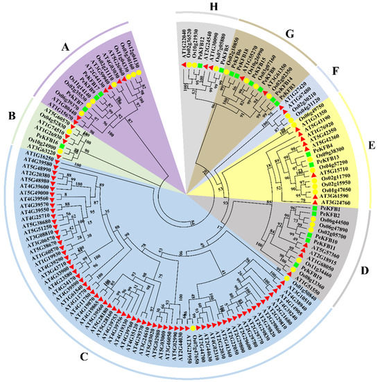 Phylogenetic analysis of KFB proteins in moso bamboo, Arabidopsis, and rice. Green squares, red triangles, and yellow circles represented moso bamboo, Arabidopsis, and rice, respectively. KFB proteins were categorized into eight subclades (A–H), which are highlighted in various colors.