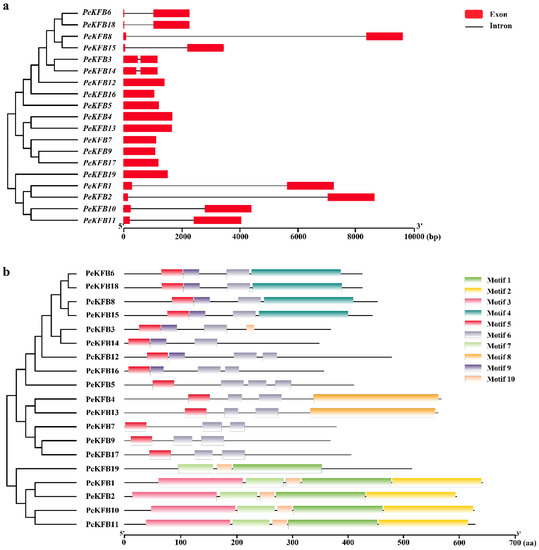 Through BLASTP with the queries of Arabidopsis and rice KFBs in the bamboo database, we looked for conserved F-box domains and Kelch domains by Pfam and SMART in all the candidates and excluded any gene that encoded truncated KFB proteins. As a result, a total of 19 Kelch repeat F-box (KFB) proteins were obtained in moso bamboo (named as PeKFB1-PeKFB19) and used for further analysis. The characteristics of the proteins encoded by PeKFBs, including the numbers of amino acids and Kelch motifs, their molecular weight, and isoelectric point, were systematically analyzed and are listed in Table S1. The amino acid lengths of PeKFBs ranged from 345 aa (PeKFB14) to 634 aa (PeKFB1) with molecular weights between 38.91 kDa and 68.29 kDa. We observed that PeKFBs had a variable theoretical isoelectric point with a high of 9.78 (PeKFB6) and a low of 4.91 (PeKFB14). All the PeKFBs were localized in the nucleus; PeKFB13 was also localized in the chloroplast. The conserved motif analysis showed that eight PeKFBs only had a single Kelch motif, four PeKFBs had two Kelch motifs, one had three Kelch motifs, and the remaining five had four Kelch motifs.