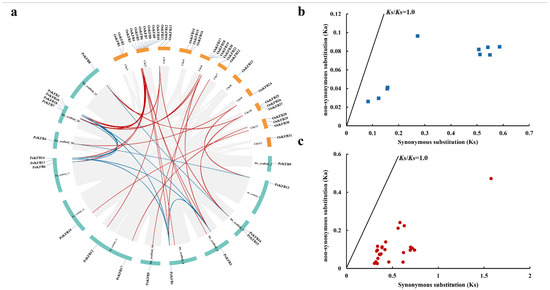 Synteny regions and Ka/Ks ratio analysis of KFBs. (a) Chromosome location and synteny regions of PeKFBs and OsKFBs. The duplicated genes of PeKFBs and PeKFBs/OsKFBs on different chromosomes are indicated with blue and red lines, respectively. (b) The Ka/Ks ratios of the gene pairs of PeKFBs. (c) The Ka/Ks ratios of the gene pairs of PeKFBs and OsKFBs.