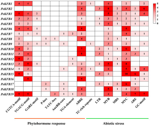 To obtain the promoter sequences of KFB genes in moso bamboo, we downloaded 2000 bp of the sequence upstream of each KFB gene coding region from the BamGDB. Cis-elements were analyzed using the database of PlantCARE (http://bioinformatics.psb.ugent.be/webtools/plantcare/html/ accessed on 19 April 2022). The number of elements in the promoters was shown in heat map made by using TBtools software.
