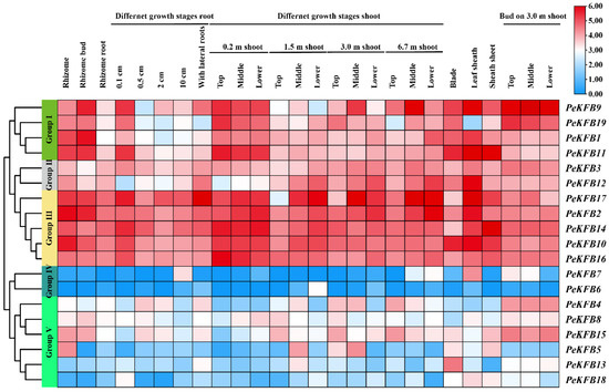 The expression patterns of 19 PeKFBs in different tissues based on RNA-seq data of moso bamboo. Hierarchical clustering heat maps were plotted based on FPKM values of 19 PeKFBs. Five groups are indicated by different colors on the left. The right heatmap shows gene expression with high levels in red and low levels in blue.