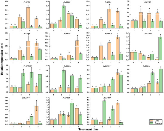 Expression patterns of PeKFBs in leaves of moso bamboo under low temperature and drought stresses. Different letters represent significant differences among different samples at p < 0.01. The average of three biological replicates along with the standard deviation (SD) are also given. The numbers 1, 2, 3, and 4 represent 0 h, 3 h, 6 h, and 12 h under stress treatments, respectively.
