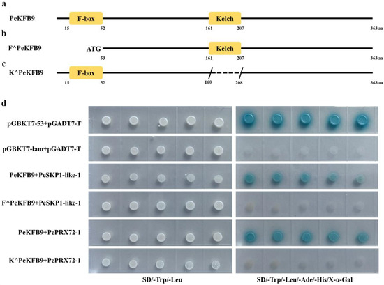 PeKFB9 showed that it was highly homologous to AtKFB01, AtKFB20, and AtKFB50, which was related to phenylpropanoid biosynthesis, and had abundant transcription levels in different tissues of moso bamboo; therefore, PeKFB9 was selected for further analysis. The full-length cDNA sequence of PeKFB9 contained an ORF of 1092 bp encoding a putative 364 amino acid protein. A sequence analysis using the Pfam website indicated that PeKFB9 contained an F-box domain in the N-termini and a Kelch repeat domain near the C-terminus (Figure 7a). To identify the proteins that may interact with PeKFB9 while participating in the lignification of moso bamboo, a cDNA library of moso bamboo shoots was constructed and a yeast two-hybrid system was conducted to screen for the interactors to find the potential chaperones of the PeKFB9 protein using pGBKT7-PeKFB9 as bait.