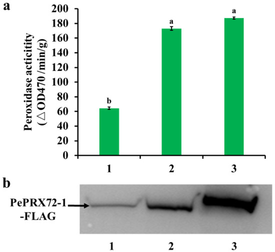 PeKFB9 attenuated the stability of PeRX72-1. (a) Peroxidase activity in crude extracts from tobacco leaves co-expressing PePRX72-1 with PeKFB9-FLAG (1), F^PeKFB9-FLAG (2), and pCAMBIA1300-3×FLAG (3). Data are the mean ±SD from three biological replicates. Different letters indicate significant differences (p < 0.01). (b) Immunoblot detection of the stability of the PePRX72-1-FLAG fusion proteins using anti-FLAG antibody in tobacco leaves co-infiltrated with PeKFB9-FLAG (1), F^PeKFB9-FLAG (2), and pCAMBIA1300-3×FLAG (3) constructs.