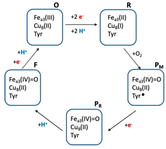 - Konstantinov, A.A. Cytochrome c oxidase: Intermediates of the catalytic cycle and their energy-coupled interconversion. FEBS Lett. 2012, 586, 630–639. [Google Scholar] [CrossRef]