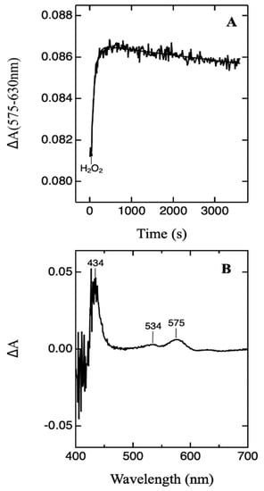 - Hiner, A.N.; Martinez, J.I.; Arnao, M.B.; Acosta, M.; Turner, D.D.; Lloyd Raven, E.; Rodriguez-Lopez, J.N. Detection of a tryptophan radical in the reaction of ascorbate peroxidase with hydrogen peroxide. Eur. J. Biochem. 2001, 268, 3091–3098. [Google Scholar] [CrossRef]