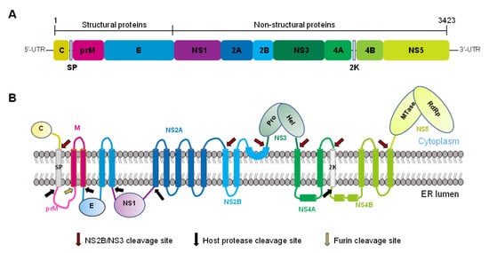 - Barrows, N.J.; Campos, R.K.; Liao, K.C.; Prasanth, K.R.; Soto-Acosta, R.; Yeh, S.C.; Schott-Lerner, G.; Pompon, J.; Sessions, O.M.; Bradrick, S.S.; et al. Biochemistry and Molecular Biology of Flaviviruses. Chem. Rev. 2018, 118, 4448–4482. [Google Scholar] [CrossRef] [PubMed]