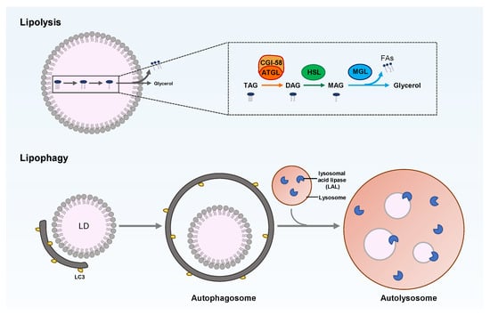 - Liu, K.; Czaja, M.J. Regulation of lipid stores and metabolism by lipophagy. Cell Death Differ. 2013, 20, 3–11. [Google Scholar] [CrossRef] [PubMed]