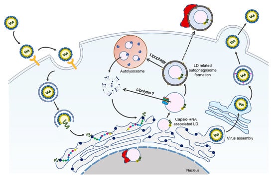 - Zhang, J.; Lan, Y.; Li, M.Y.; Lamers, M.M.; Fusade-Boyer, M.; Klemm, E.; Thiele, C.; Ashour, J.; Sanyal, S. Flaviviruses Exploit the Lipid Droplet Protein AUP1 to Trigger Lipophagy and Drive Virus Production. Cell Host. Microbe. 2018, 23, 819–831. [Google Scholar] [CrossRef]