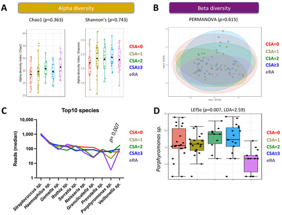Alpha diversity, beta diversity and the oral abundance at the genus level in 15 patients with early rheumatoid arthritis (eRA), and 69 controls subdivided according to their clinically suspect arthralgia (CSA) score. (A) Alpha diversity as tested by Chao1 index and Shannon’s index. (B) Beta diversity tested by PERMANOVA (permutational multivariate analysis of variance); the percentage of variation explained by the principal component analysis (PCA) is indicated on the axes. (C) Top 10 genera with highest relative abundance in the 5 subgroups tested; (D) Box plots showing the relative abundance of the genus Porphyromonas sp. in controls and eRA. p values are based on Linear discriminant analysis (LDA) effect Size (LEfSe).
