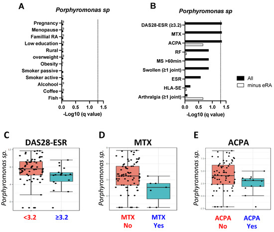 Association between oral Porphyromonas sp. levels and rheumatoid arthritis (RA) associated risk-factors (A) and pre-RA/RA clinical factors (B) identified by linear discriminant analysis effect size (LEfSe) analysis in 84 individuals including (black boxes) or not (white box, minus eRA) 15 patients with early-(e)RA. For graphical purposes, calculated false discovery rate q values are represented as -Log10 and the significant threshold was fixed at 1.3 (q = 0.05, dot line). Boxplots of the 3 bioclinical factors associated with Porphyromonas sp. level reduction within the 84 individuals: (C) disease activity (DAS28-ESR); (D) the use of methotrexate (MTX); and (E) anti-citrullinated peptide/protein antibodies (ACPA).