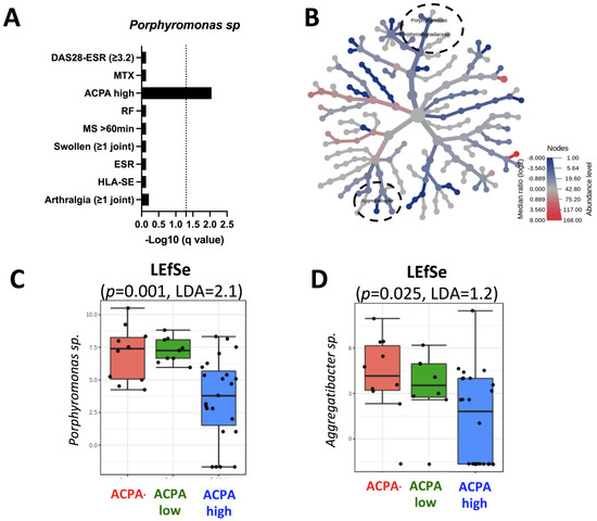 Elevated anti-citrullinated peptide/protein antibody (ACPA) levels are associated with oral Porphyromonas sp. and Aggregatibacter sp. level reduction in patients with rheumatoid arthritis (RA). (A) Association between oral Porphyromonas sp. levels and RA associated factors in 42 RA patients. (B) differential heat-tree matrix depicting the taxa abundance in RA patients according to the presence of ACPA at elevated levels. The red node (log 2-fold) indicates a higher abundance of the taxon, while the blue node indicates the opposite. (C,D) Boxplots showing specific differences in the relative abundances of discriminant Porphyromonas sp. and Aggregatibacter sp. according to the ACPA status: negative, low levels (upper limit of normal [ULN] = 1–2.9), and high levels (ULN > 3) (p < 0.05).