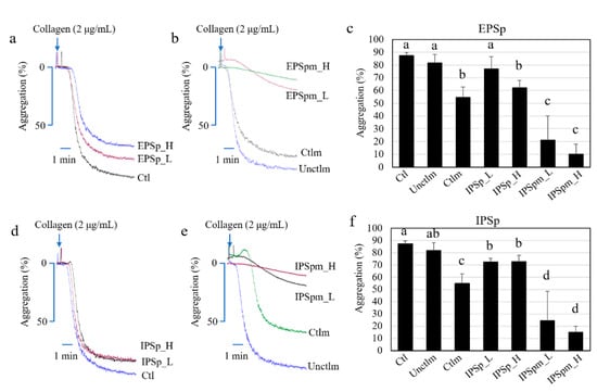 v) for 40 min at 37 °C. Platelet aggregation was stimulated by collagen (2 μg/mL). The light transmission was monitored and documented for at least 6 min. PBS was used as the negative control (Ctl). The basal medium before fermentation was used as the medium control (Unctlm), and the basal medium without PS after fermentation was used as the fermentation control (Ctlm). All the data were collected and processed by Aggrolink8 software.