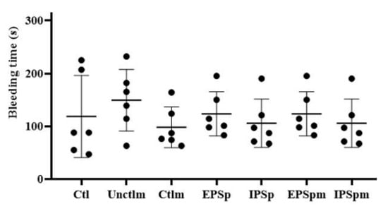 Male C57BL/6J mice (aged 6–8 weeks old) purchased from Sun Yat-sen University were injected intravenously via the tail vein with 0.2 mL of EPSp (5 mg/mL), IPSp (5 mg/mL), EPSpm (5 mg/mL), IPSpm (5 mg/mL), PBS (Ctl), fecal fermentation basal mediums before (Unctlm) and after fecal fermentation (Ctlm). The doses of different interventions in the animal study were calculated according to the doses used in the in vitro experiments, and finally achieved approximately 1 mg/mL in the murine blood. Mice were placed on a heating pad (37 °C), and anesthetized by sodium pentobarbital after 40 min. Five millimeters of the tail tip was cut off, followed by immediately placing the tail into a warm (37 °C) saline solution. The bleeding time was recorded as the period from the moment that bleeding began to the moment that bleeding ceased [