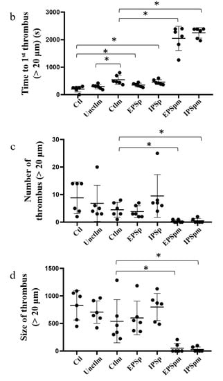 4.14. Intravital Microscopy of Thrombosis Induced by FeCl3 In Vivo