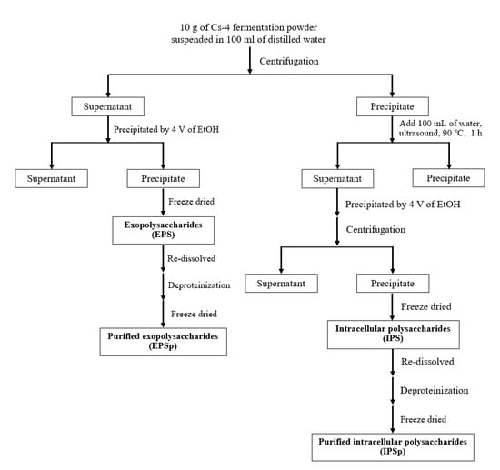 Figure 7 shows the production process of Cs-4 polysaccharides. Ten grams of Cs-4 powder was suspended in 100 mL of Milli-Q water with vigorous stirring for 1 h. The suspension was centrifuged at 4000×