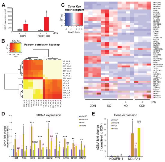 dNs treatment increased mtDNA copy number and alters global gene expression. (A) MtDNA copy number was increased in both control (CON) and ECHS1 KO cells after 8 days of dNs treatment. (B) Pearson correlation heatmap of transcriptome expression in CON cells and ECHS1 KO (KO) cells, either untreated (ut) or treated with dNs for 8 days. (C) Heatmap of 50 most significantly differentially expressed genes across all samples. The expression of mtDNA-encoded transcripts was increased in both CON and ECHS1 KO cells following dNs treatment. (D) Expression of mtDNA-encoded transcripts was increased following dNs treatment in both CON and ECHS1 KO cells. (E) Expression of nuclear-encoded OXPHOS complex I subunit genes were increased in both CON and ECHS1 KO cells following dNs treatment. Data shown is mean ± standard deviation (s.d.), with n ≥ 3. * p < 0.05, ** p < 0.01, *** p < 0.001 compared to untreated (ut) CON cells; # p < 0.05, ## p < 0.01, ### p < 0.001, #### p < 0.0001 compared to untreated (ut) ECHS1 KO cells (Student’s two-tailed t tests).