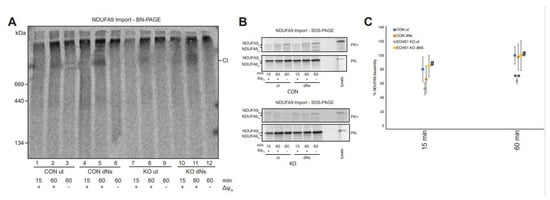 As previously observed [25], the amount of assembled NDUFA9 in untreated ECHS1 KO cells (Lane 8) was significantly lower than in untreated CON cells after 60 min (Lane 2) (p < 0.01). However, dNs treatment of ECHS1 KO cells increased the amount of assembled NDUFA9 after 15 min (Lane 10, p < 0.05) and 60 min (Lane 11, p < 0.05) of import (Figure 5A). This increased the amount of NDUFA9 assembled in dNs treated ECHS1 KO cells to similar levels observed in untreated CON cells (Figure 5C).