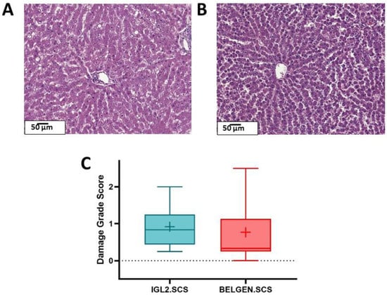 Liver histology after 24 h SCS + 2 h NMP. (A) IGL2.SCS (B) BELGEN.SCS (C) The damage grade score (DGS) was assessed by an expert pathologist and tended to be higher in the IGL2.SCS Group (p = 0.68) (Kruskal–Wallis test).