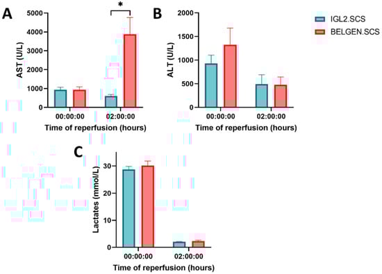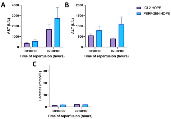 Transaminases and lactates were measured to assess hepatocyte injury biochemically. For both experimental groups, we observed that AST levels increased between 0 and 2 h (Figure 6). However, after two hours of reperfusion, AST levels seemed to be lower in the IGL2.HOPE groups. On the other side, we observed a slight decrease in alanine transferase (ALT), the liver-specific enzyme in the IGL2.HOPE group while in the PERFGEN. HOPE group ALT level increased over time. ALT decrease in IGL2.HOPE group could suggest a reduction in hepatocyte injury. Lactate levels, though staying constant in the physiological range over time, did not show any difference observed between the two groups.