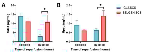 Glycocalyx integrity during reperfusion at 37 °C following 24 h of SCS. Proteins expression of SDC1 and HPSG by ELISA were measured from perfusates. (A) SDC1 levels were significantly lower after 2 h of reperfusion in the IGL2 group (p = 0.04). (B) HPSG levels were significantly lower after 2 h of reperfusion in the IGL2 group (p = 0.01). n = 6/group. * = p <0.05.