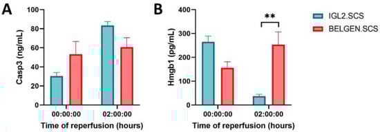 Caspases are proteases involved in the regulation of apoptosis. The expression of caspase 3, an executioner caspase that is activated when cleaved, is used to assess and compare the levels of apoptosis in the two groups. Between 0 and 2 h, we observed an increase in caspase 3 levels in both groups (Figure 4). However, no significant differences were observed between the two experimental groups. High Mobility Group Box-1 (HMGB1) is a ubiquitous DNA-bound protein that acts as a cytokine when released by the nucleus in response to stress through the initiation of inflammation. At T0, the HMGB1 level was higher in IGL2.SCS compared to BELGEN SCS. However, after 2 h of reperfusion, the HMGB1 level was significantly lower in the IGL2.SCS compared to BELGEN.SCS. We observed that the HMGB1 level was significantly lower in the IGL2.SCS group compared to the BELGEN.SCS group.