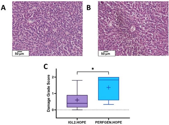 Liver histology after 24 h SCS + 2H HOPE + 2H NMP. (A) IGL2.HOPE (B) PERFGEN.HOPE (C) The damage grade score (DGS) was assessed by an expert pathologist and was significantly lower for the IGL2 group (p = 0.02). (Kruskal–Wallis test). * = p < 0.05.