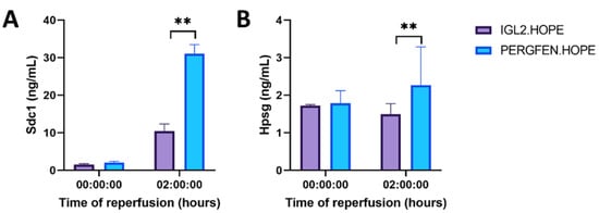 Glycocalyx integrity during reperfusion at 37 °C following 24 h of SCS and 2 h of HOPE. Proteins expression of SDC1 and HPSG by ELISA were measured from perfusates. (A) SDC1 levels were significantly lower after 2 h of reperfusion in the IGL2 group (p < 0.01). (B) HPSG levels were significantly lower after 2 h of reperfusion in the IGL2 group (p < 0.01). n = 6/group. ** = p < 0.01.