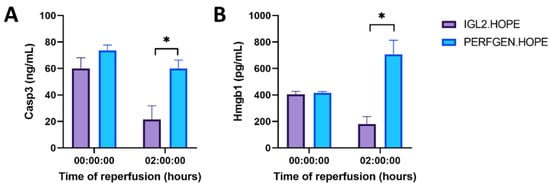 We measured programmed cell death using a cleaved caspase 3 marker. We observed that the caspase 3 level decreased over time in the IGL2.HOPE group compared to the PERFGEN.HOPE group where caspase 3 levels seemed to remain at a similar value (Figure 8). Moreover, we observed that caspase 3 was significantly higher in the PERFGEN.HOPE group after 2 h of reperfusion compared to the IGL2.HOPE group. Inflammation was measured using high mobility group box-1 (HMGB1). A reduction of the HMGB1 level between T0 and T120 was observed in the IGL2.HOPE group compared to PERFGEN.HOPE. Indeed, HMGB1 levels increased over time in the PERFGEN.HOPE group. Finally, the HMGB1 level was significantly lower in the IGL2.HOPE group compared to the PERFGEN.HOPE group after two hours of reperfusion.