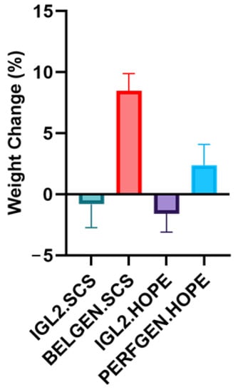 Livers were weighed at three time points of preservation: before SCS, after SCS, and after reperfusion at 37 °C (POST-NMP) (Figure 9). We used weights as a probe of water retention and edema formation. We observed that IGL2 preserved livers’ weight change was negative, while BELGEN and PERFGEN livers’ weight change was positive between the PRE-SCS and POST-NMP phases. In addition, we observed that the BELGEN.SCS group demonstrated the highest weight gain throughout the preservation process. The IGL2.HOPE group seemed to have retained the lowest amount of water during preservation.