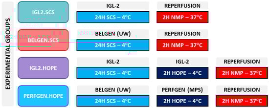 Four experimental groups (n = 6/group) were designed (Scheme 1) to compare the IGL-2 preservation solution to the gold standard of static preservation, BEL-GEN® (Institut Georges Lopez, France), and the gold standard of dynamic preservation, PERF-GEN® (Institut Georges Lopez, France). BEL-GEN and PER-GEN have the same composition as the original ones developed at the University of Wisconsin by F.O. Belzer and J. Southard, respectively, named UW and UW-MPS.
