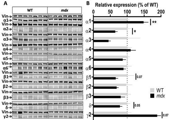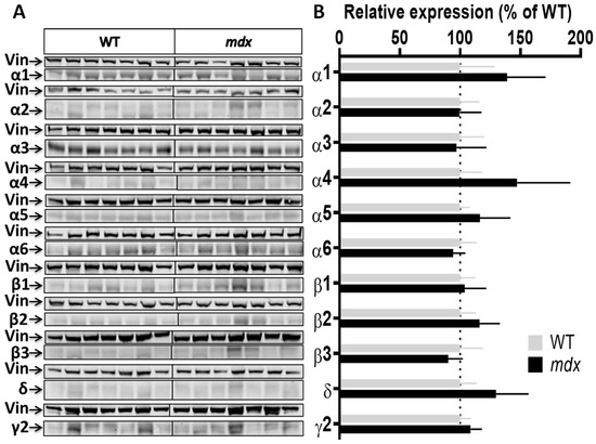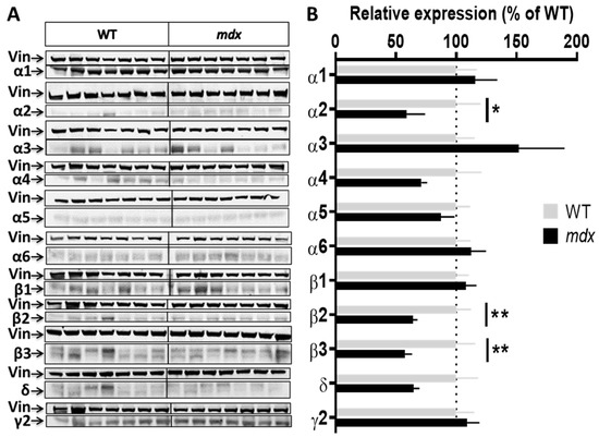 Hippocampal samples (Figure 2A,B) from mdx mice showed a 40% decrease in the expression level of the α2 subunit (p < 0.0205), a 35% decrease for the β2 subunit (p < 0.0082), and a 42.5% decrease for the β3 subunit (p = 0.0041) as compared with WT, while all other subunits had an expression level comparable to that of WT mice.