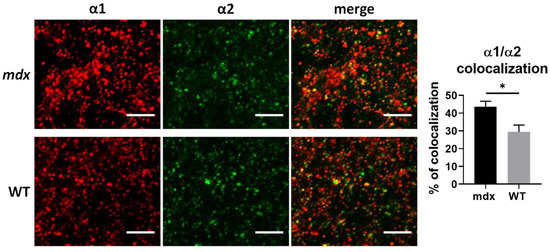 Colocalization of α1 and α2 GABAAR subunits in the cortex. The left panel shows representative sample confocal laser scanning microscope images of α1-subunit (red) and α2-subunit (green) immunoreactive signals, as well as merged images of overlaps (yellow dots) between α1-subunit and α2-subunit immunoreactivity in WT and mdx mice. The histogram on the right shows the fraction (%) of clusters showing overlaps and reflecting presumed colocalization of these two synaptic subunits. Scale bar: 5 µm. * p < 0.05.