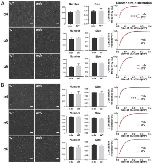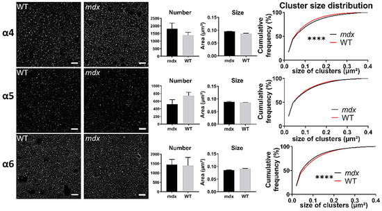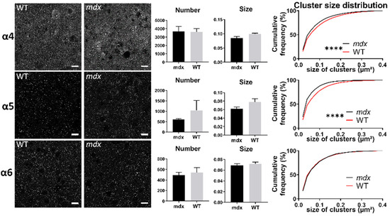 In the cerebellar molecular cell layer (MCL) (Figure 8), the mean number and mean size of clusters containing α4, α5, and α6 subunits were comparable in the two genotypes (p > 0.05). However, the distribution of cluster sizes in mdx mice showed a significant rightward shift for clusters containing the α4 subunit (p < 0.0001), and a leftward shift for those containing the α6 subunit (p < 0.0001). This suggests a larger proportion of big α4 subunit-containing clusters and of small α6-containing clusters.