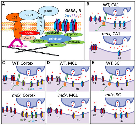Brain dystrophin deficiency and the multiple alterations of GABAAR subtypes in distinct regions of the nervous system. (A) Diagram showing the interaction of the dystrophin-associated complex (α and β dystroglycans) with key postsynaptic scaffolding proteins (Neuroligin-2, neurexin, S-SCAM, IQsec3) involved in the regulation of GABAAR clustering in central inhibitory synapses. As indicated in top right corner, the different colors in GABAARs correspond to the α subunits (light blue), β subunits (purple) and γ2 subunits (red). (B–E) Schematic summary of the results obtained in this study comparing the expression and distribution of synaptic and extrasynaptic GABAAR subunits in WT and dystrophin-deficient mdx mice. The working models combine expression-level data from semi-quantitative immunoblots and distribution of cluster sizes from IF confocal analyses. The main type of α subunit contained in the displayed receptors is indicated (subunits’ colors are arbitrary, but the font color matches the color of the subunits in the drawing when their expression is changed in mdx mice). Arrows below isolated synaptic GABAARs in the mdx-cortex drawing indicate decreased (down) or increased (up) expression levels of specific α subunits. Adjacent receptors symbolize large clusters. CA1: Hippocampal CA1 area; MCL: molecular cell layer of cerebellum; SC: spinal cord.