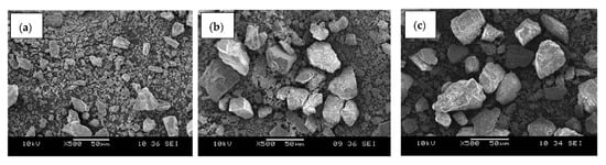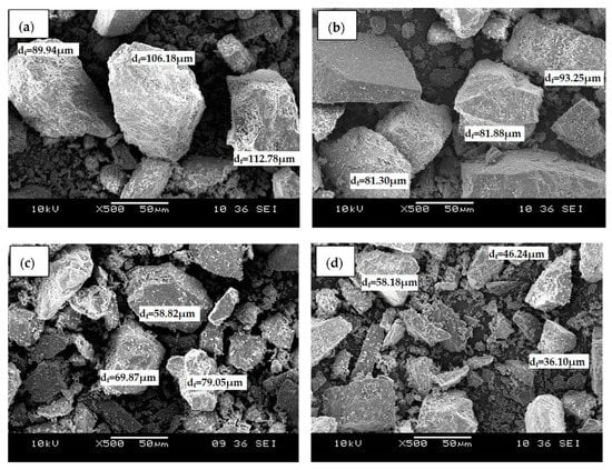 Figure 1c,d, which correspond to the dolomite that was ball-milled at 400 rpm and 500 rpm, respectively. The dolomite that was ball-milled with a speed of 300 rpm and 400 rpm were reduced to a Feret diameter (d