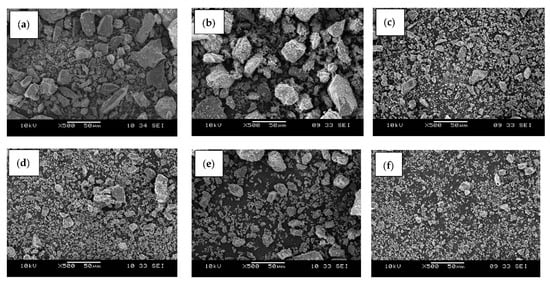500). The micrographs revealed that the dolomite had an irregular shape and rhombohedral structure. The shape and structure of the dolomite appeared identical in all images, even when the dolomite was ball-milled with the highest speed, which was 500 rpm. Originally, the dolomite powder was supplied with a particle size of less than 150 µm as shown in