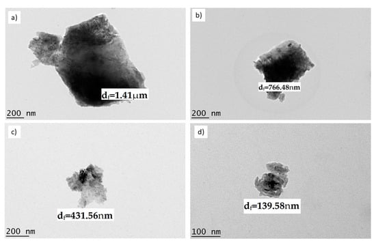 Figure 2b,c reveal that the size of the dolomite became larger when a longer tip-ultrasonication time was used (3 h and 5 h). This demonstrates that the duration of ultrasonication influenced the particle size. It has been proven that the particle size decreases as the duration of ultrasonication increases [