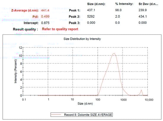 Prior to the particle size analysis, 0.15 mg of dolomite was dispersed in 2 mL of solvent. In order to separate large aggregates and agglomerates in the sedimentation, the dispersion was allowed to stand for 1–2 h. Subsequently, the particle size distribution was measured with a Malvern Instruments Zetasizer Nano ZSP using NIBS technology and dynamic light scattering (Malvern Panalytical Ltd., Malvern, UK).
