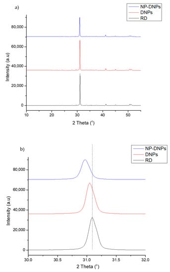 A Bruker D2 phaser benchtop X-ray diffractometer (Bruker Corporation, Billerica, MA, USA) was used to characterize changes in the RD, DNPs, and NP-DNPs components. The sample was analyzed in the range of 10° to 55° with a step size of 0.022 and a time per step of 19.2 s. This X-ray diffractometer operated at 30 kV using Cu Ka α rays (λ = 0.15406). The crystallinity or peak-to-noise ratio of the samples was calculated using Equation (1):