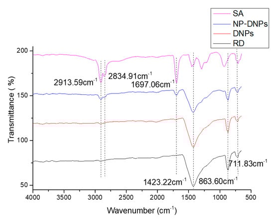 An FTIR analysis was performed to identify and compare the functional groups present in the FTIR spectra of the RD, DNPs, and NP-DNPs. A Perkin Elmer RXI FTIR spectrophotometer (Waltham, MA, USA) was employed for this analysis. The FTIR analysis by the ATR method was performed in the range of 4000–650 cm−1. The spectra were recorded with 16 scans and a resolution of 4 cm−1.
