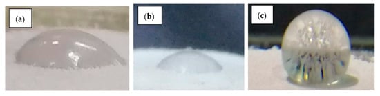 A contact angle analysis was performed to analyze the wettability of the dolomite before and after a surface treatment with stearic acid. Dolomite powder was placed onto a thin layer of plasticine on top of a glass slide. It was flattened to obtain a smooth surface. Then, a drop of distilled water was dropped onto the dolomite surface using a syringe. The image of the droplet was captured by a direct phone camera with an attached micro lens. The contact angle was analyzed and calculated using imageJ software with the drop analysis plug-in. Three angles were measured for each sample, and the average value was calculated.