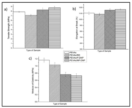 Figure 11 compares the tensile strength, the elongation at break, and the modulus of elasticity for the PEVAc/RD, PEVAc/DNP, and PEVAc/NP-DNP, while