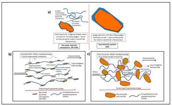 Figure 13b,c, the presence of large particles of raw dolomite increased the stiffness of the PEVAc by restricting the molecular motion of the copolymeric chains. In addition, the unaligned particles, which do not follow the direction of stress, would have hindered the stretching of the copolymeric chains to a greater extent. Consequently, the matrix became brittle and more easily fractured under the tensile load. On the other hand, the elongation at break of the PEVAc/DNP and PEVAc/NP-DNP increased by 4.5% and 5.6%, respectively. This suggests that the smaller-sized dolomite fillers did not restrict the movement of the PEVAc molecular chains, but moved and aligned together with the copolymeric chains [
