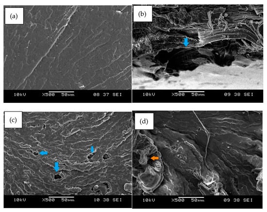 Figure 14 reveals the fractured surface morphology of (a) PEVAc, (b) PEVAc/RD, (c) PEVAc/DNP, and (d) PEVAc/NP-DNP. The virgin PEVAc possessed a smooth fractured surface, while the PEVAc/RD showed a rough surface. This was due to the poor dolomite dispersion in the PEVAc matrix. A large void could also be spotted due to the filler pulling out upon stretching (see