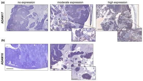 Physiologically, ADAM10 and ADAM17 are expressed in a large variety of tissues comprising, e.g., heart, prostate, kidney, and small intestine, as well as fetal lung, liver, and brain []. Aberrant expression or dysregulation of ADAMs has been linked to inflammatory and cardiovascular diseases as well as neurodegenerative disorders and numerous cancer entities [,]. A previous study by our group revealed significantly increased ADAM10 and ADAM17 protein and RNA expression levels in retinoblastoma cell lines, as well as upregulated RNA levels in RB patient tumor samples as compared to the healthy human retina []. Ebsen et al. likewise reported comparatively high expression levels of ADAM10 in Jurkat, pancreatic adenocarcinoma, Hela, fibrosarcoma, and Hodgkin’s lymphoma cell tumor cell lines []. Along this line, upregulated expression of ADAM17 and/or overexpression of ADAM10 has been associated with tumor progression as well as poor prognosis of numerous human cancers, e.g., gastric, colon, breast, pancreatic and lung cancer and hepatocellular carcinoma (for review see [,,]). In the study presented, we approached the expression of both ADAMs immunohistochemically and revealed a moderate to high ADAM17 and a distinctly weaker ADAM10 protein expression in RB patients’ tumor sections. Moreover, ADAM17 expression significantly correlated with the bilaterality of RB tumors and high ICRB stages, whereas ADAM10 showed no correlation with clinical parameters. Fitting our data, ADAM10 and ADAM17 (over) expression levels likewise significantly correlates with tumor grade in glioma, and both ADAMs are discussed as prognostic markers and therapeutic targets [,,].