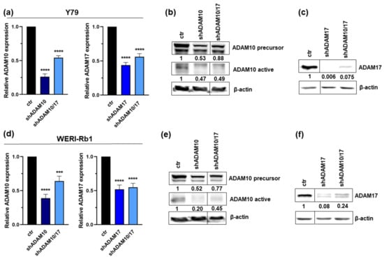 Verification of ADAM10 and ADAM17 knockdown efficiency. Efficient stable, lentiviral ADAM10 (shADAM10), ADAM17 (shADAM17) and ADAM10/17 (shADAM10/17) double knockdown was verified by quantitative real-time PCR (a,d) and western blot analyses in Y79 (b,c) and WERI-Rb1 cells (e,f). Indicated intensity ratios relative to ß-actin, used as a loading control, were calculated using MICRO MANAGER 1.4 software. Values are means of three independent experiments ± SEM. *** p < 0.001 and **** p < 0.0001 statistical differences compared to the control (ctr) group calculated by Student’s t-test.